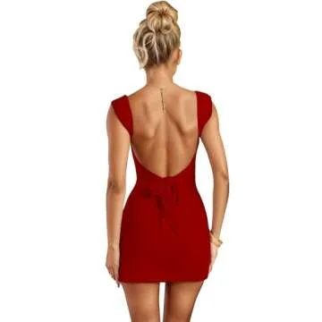 SHESEEWORLD Women's Sexy Summer Sleeveless Tie Waist Back Square Neck Backless Slit Hem Ruched Bodycon Mini Tank Dress Red
