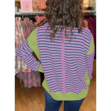 SHEWIN Crewneck Sweatshirts Women Fall 2024 Striped Color Block Long Sleeve Fashion Casual Loose Y2K Pullover Tops Clothes Outfits Pink Medium