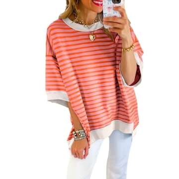 SHEWIN Shirts for Women 2025 Loose Short Sleeve Sweatshirt Cute Womens Spring Tops Casual Crewneck Color Block Tee Shirt Trendy Cute Summer Outfits Orange Stripe XL