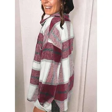 SHEWIN Women's Flannel Shirts Long Sleeve Plaid Lapel Casual Button Up Shacket Jacket Coats with Pockets Fall Tops for Women,US 8-10(M),Deep Red