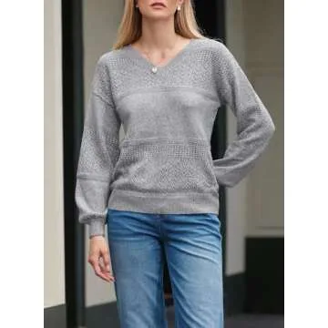 SHEWIN Womens Fashion Crochet Sweaters Casual Lightweight Long Sleeve Hollow Out Sweater Tops V Neck Cable Knit Pullover Jumper Spring Outfits for Women 2025, US 8-10(M), Gray