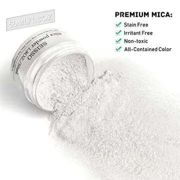 Show more Introducing the SEISSO Huge Capacity Bottled Mica Powder in Shining Pearl White - a must-have for every crafting enthusiast! This premium mica powder pigment, weighing 50 grams (1.76 ounces), is designed to elevate your artistic projects with its fine texture and shimmering finish. Made from all-natural minerals, this mica powder boasts a small micron size, ensuring exceptional coverage and dispersion while providing that coveted pearlescent effect.