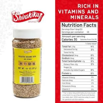 Show moreDiscover the exquisite flavor of Shirakiku Roasted Sesame Seeds (IRI GOMA), an ideal topping for salads, sushi, and noodle dishes. Each 8 oz pack is filled with perfectly roasted white sesame seeds, offering a delightful crunch and a distinctive nutty aroma that elevates your culinary creations. These seeds bring authentic Japanese and Asian culinary elements right to your kitchen, transforming simple meals into gourmet experiences. Not only are they delicious, but they are also a healthy choice with no cholesterol or trans fats, making them a guilt-free addition to any diet.
