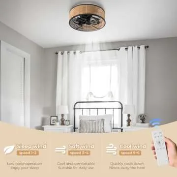 shitougu 20 Inch Boho Flush Mount Ceiling Fan with Light Remote Control, Rattan Ceiling Fan with Light, Caged Enclosed 6 Speeds for Bedroom Kitchen Living Room