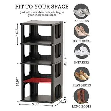 Show moreDiscover the ultimate solution for your shoe storage needs with our Shoe Organizer Rack for Small Spaces. This 5-tier plastic vertical narrow shelf is designed specifically for small areas, allowing you to maximize your space efficiently. Crafted from high-quality, durable PP material, this shoe organizer not only enhances your living space but also ensures longevity with its water-resistant construction. Its modular design offers the flexibility to change the height of the cubbies, making it versatile enough to store everything from stylish flats to towering high heels with ease. With dimensions of 9.56 x 10.23 x 22.53 inches, it perfectly suits any entryway, closet, or any tight corner in your home, transforming clutter into organized bliss.