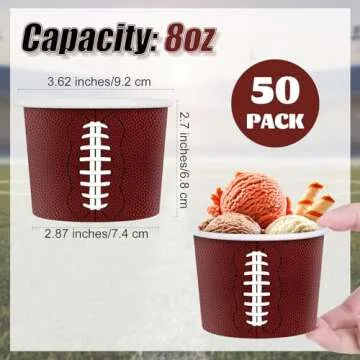 Show more Introducing the ultimate party essential for sports enthusiasts and food lovers alike - the Shojoy 100 Pieces Football Snack Bowls! These 8oz disposable paper bowls are designed with a vibrant football theme, making them the perfect addition for game day gatherings and any sports-themed event. Serving a variety of snacks has never been easier with this convenient and stylish packaging. Each bowl measures approximately 3.35 inches in diameter at the edge, ensuring a generous serving size that's ideal for sampling everything from delicious chili to creamy ice cream.