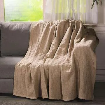 Show more Introducing the beautifully crafted Shop LC 100% Cotton Beige Throw Blanket, a stunning addition to any home that effortlessly combines comfort and style. Measuring a generous 68x90 inches, this throw blanket is designed with a unique woven checker pattern that not only adds visual charm but also provides a soft, breathable experience. Made from premium-quality cotton, this blanket offers a gorgeous aesthetic while ensuring warmth during chilly summer evenings or crisp fall nights. Its lightweight construction ensures that you won’t feel overheated, making it the ideal companion for cozy nights on the couch or as a decorative accent on your bed.