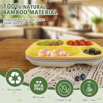 Show more Introducing the amazing Bamboo Divided Plates designed specifically for kids and adults alike! Made from a unique blend of bamboo fiber, corn starch, and food-grade melamine, this set of plates is not only eco-friendly but also completely BPA-free and non-toxic. Say goodbye to messy meal times as these plates boast four convenient compartments, perfect for keeping different types of food separated. This feature ensures balanced diets and portion control, making mealtime enjoyable and structured.