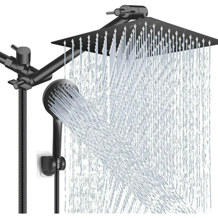 Show moreWelcome to the ultimate shower experience with our all-encompassing Shower Head Combo. This meticulously designed set includes a 10” Large Square Rain Showerhead paired with a high-pressure handheld shower, offering versatility and customizable options to enhance your showering routine. Tailor-made for both adults and children, it provides a soothing, spa-like experience right in your home. Carefully constructed with over 100 self-cleaning silicone nozzles, the large rain shower head ensures a full-body waterfall coverage that prevents lime and hard water build up, while providing a 360-degree adjustable angle for a leak-free, perfect positioning. On the other hand, the 5-mode handheld shower features settings suited for everything from a gentle baby shower to a vigorous massage, making it ideal for diverse needs, including pet bathing.