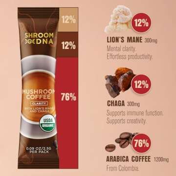 ShroomDNA Mushroom Coffee Blend with Chaga & Lion's Mane | Instant Focus + Clarity All Day | Organic + Vegan + Gluten Free | No Added Sugar | 20 Count