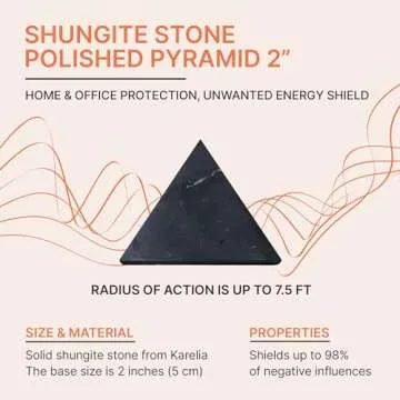 Show more Experience the transformative power of the Shungite Protection Pyramid, meticulously crafted from genuine Type III shungite, sourced from the unique Zazhoginsky deposit in Karelia, Russia. With its compact size of just 2 inches (50 mm) and a remarkable radius of action extending up to 7.5 feet, this stunning pyramid serves as both a striking decor piece and a potent energy harmonizer.