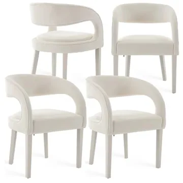 Show more Introducing the Shunzhi Modern Barrel Dining Chairs Set of 4, where elegance meets comfort in every detail. Crafted with a rich, modern aesthetic, these chairs feature sculpted lines and all-over performance upholstery that not only enhances their stylish edge but also ensures durability for everyday use. The large, hollowed-out round backrest provides not only a striking visual appeal, but also exceptional back support. Sturdy wood legs enhance the overall design while providing the security needed to comfortably support up to 300 pounds. Whether you are hosting guests or enjoying a family meal, these chairs elevate the tone of your dining room or living space.