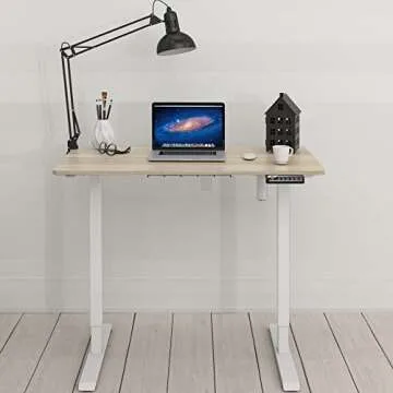 Show more Introducing the SHW 40 x 22 Inches Electric Height Adjustable Sit to Stand Desk, a revolutionary workplace solution designed to cater to your ergonomics and productivity needs. Crafted with premium materials, this desk features a high-grade industrial steel frame, ensuring durability and stability for daily use. The table's stunning white frame paired with a sleek maple top offers a modern aesthetic that seamlessly blends with any office decor. Equipped with a powerful electric lift system, you can effortlessly transition from a sitting to standing position with just a push of a button, thanks to the intuitive digital display handset incorporated into the design.