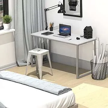 Show moreIntroducing the SHW Home Office 40-Inch Computer Desk in a sleek white finish, designed to elevate your workspace with modern elegance and functionality. This desk seamlessly integrates into any environment, be it a home office, bedroom, studio, or even as a unique dining table in the kitchen. Crafted from high-quality materials, including a sturdy steel frame with a powder-coated finish and eco-friendly particle board, this desk promises durability while maintaining an aesthetic appeal.