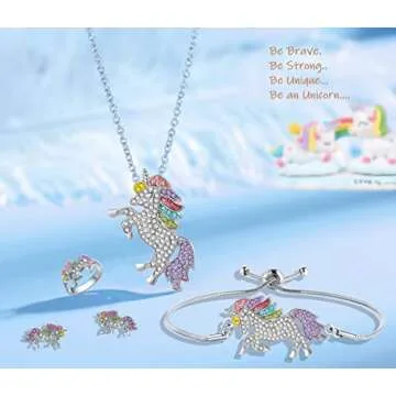Show more Welcome to a realm of enchantment with our exquisite Unicorn Jewelry Set, a collection designed to ignite the imagination of every little girl. This stunning set features a beautifully crafted Unicorn Necklace, Bracelet, Earrings, and Ring, all adorned with vibrant sparkling rainbow crystals that dance in the light, making it an enchanting gift for any occasion. The Unicorn, symbolizing bravery, uniqueness, and magic, will surely delight your loved one and fill their heart with joy.
