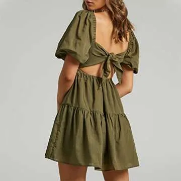 Shy Velvet Women's Casual Party Mini Dress Square Neck Short Bubble Sleeve A-line Loose Summer Dresses Green