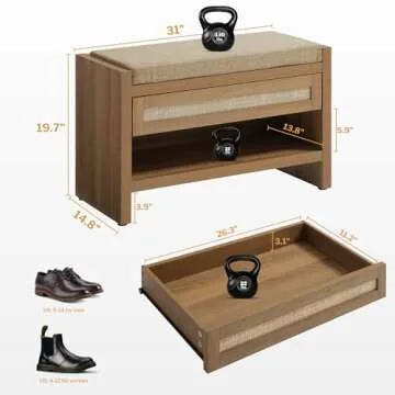 SICOTAS Rattan Shoe Bench Entryway Bench with Storage Drawer and Linen Seat Cushion, Farmhouse Boho Shoe Rack Bench with Shelf, Wooden Storage Bench for Entryway Hallway and Bedroom, Natural Oak