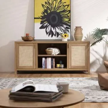SICOTAS TV Stand for Living Room : Rattan TV Console Cabinet with Storage and Shelf, Boho Entertainment Center, 59" Media Console for 55, 65 Inch TV, 26" Tall Television Stands, Oak