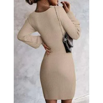 Sidefeel Fall Dresses for Women 2024 Casual Ribbed Knit Long Sleeve V Neck Pullover Sweaters Fall Fashion Winter Sexy Bodycon Sweater Dress X-Small Khaki
