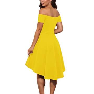 Show moreStep into the spotlight with the stunning Sidefeel Women Off Shoulder Short Sleeve High Low Skater Dress. This eye-catching dress is designed to make a statement; crafted with a sleek, high-low hemline, it features a stylish off-shoulder design that exquisitely accentuates your shoulders while providing comfort and ease of movement. Made from premium quality fabric, this dress promises a flattering fit for any figure, particularly in the coveted XX-Large Yellow size that brightens any wardrobe. Whether you're headed to a summer garden party or a casual day out, this dress offers versatility without compromising on style.