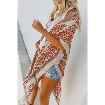 Sidefeel Women Print Pom Pom Tassel Kimono Beach Cover Up Cardigan Top One Size Orange