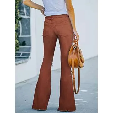 Show more Introducing the Sidefeel Womens Distressed Button Fly Jeans – a perfect blend of style and comfort! These med brown bell bottom denim pants are designed to elevate your wardrobe while offering unmatched wearability. Made from a premium fabric blend of 71% cotton, 27.5% polyester, and 1.5% spandex, these jeans are not only lightweight and cozy but also provide the stretch and durability needed for everyday activities. Whether you're dressing up for a night out or keeping it casual during the day, these jeans are a versatile addition to your collection.