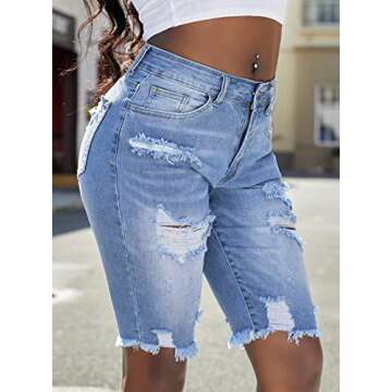 Show moreIntroducing the Sidefeel Women’s Ripped Denim Bermuda Shorts – your new go-to wardrobe staple for all your stylish occasions. Crafted from soft and breathable denim, these shorts combine comfort with a chic aesthetic that you will love to wear all summer long. The versatile above-knee length and fashionable raw hem design make them perfect for pairing with fitted or flowy tops, whether it’s a tank, crop top, or casual blouse. The unique distressed detailing on the front thigh and back pockets adds an edgy touch, ensuring these shorts are not just another piece in your closet, but a standout item for your everyday style.
