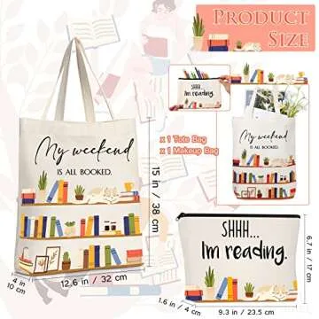 Sieral 2 Pcs Book Lovers Gifts Bookshelf Tote Bag Makeup Reading Canvas Bag Reusable Book Tote Bag Cosmetic Pencil Cases School Bag Gift with Metal Zipper Bookish Librarian Gifts for Women Teacher