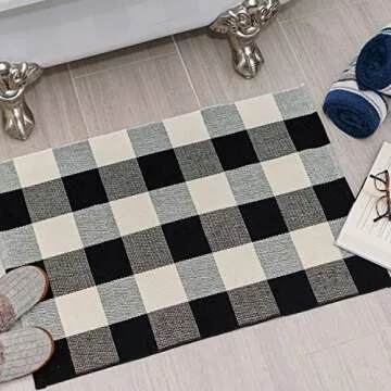 Show more Introducing the perfect addition to your home decor—the hand-woven layered check plaid rugs. Crafted with care, these rugs embody a beautiful balance of style and functionality. The classic black and white buffalo checkered design breathes life into any space, making it ideal for both indoor and outdoor settings. Whether you place them in your entryway, kitchen, or patio, these rugs will elevate your aesthetic while ensuring durability.