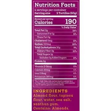 Show moreIntroducing the Siete Almond Flour Tortillas, the ultimate gluten-free and grain-free solution for anyone looking to enjoy authentic Mexican flavors without compromising on dietary needs. Crafted by Siete Family Foods, these tortillas are not only delicious but also feature a satisfying fluffy texture that makes them perfect for a wide range of culinary creations. Each pack contains 8 delectable tortillas, and with our pack of 6, you’ll always have a stash on hand for Taco Tuesdays, brunches, or quick lunches!
