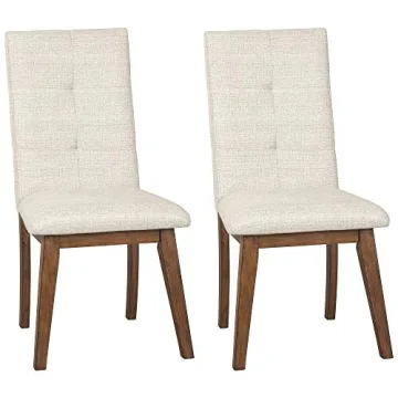 Show moreExperience dining in style with the **Signature Design by Ashley Centiar Mid Century Upholstered Dining Chair** set. Exquisitely crafted with a stunning stone-colored fabric, these chairs are the perfect combination of modern elegance and classic charm. Their slightly curved legs, featuring a rich chestnut finish, not only enhance their aesthetic but also ensure stability and support during every meal. Designed for comfort, the chairs come with a plush cushioned seat wrapped in high-performance Nuvella polyester, making them resistant to stains and wear. Transform your dining area into a stylish haven with these beautifully upholstered additions that blend with any decor, ensuring they are as functional as they are visually appealing.