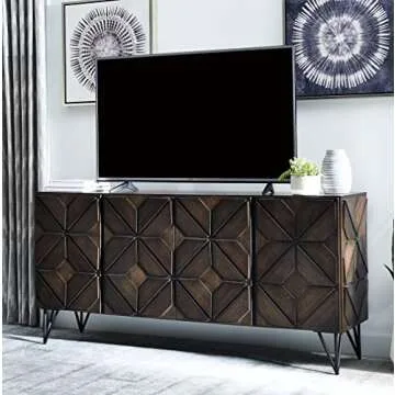 Show moreIntroducing the Signature Design by Ashley Chasinfield Urban Geometric Design TV Stand, a stunning blend of style and functionality that seamlessly integrates into your home décor. Crafted with durable mango veneers and engineered wood, this TV stand features a luxurious dark brown espresso finish that complements a variety of design aesthetics, including modern, mid-century, and minimalist. With generous dimensions of 60.88" W x 18" D x 34.88" H, it can easily accommodate your flat screen or monitor of up to 70 inches. This piece isn't just about looks; it's a practical storage solution, equipped with four stylish cabinet doors featuring a unique dimensional overlay pattern, and three adjustable shelves to fit your needs.