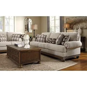 Signature Design by Ashley Harleson Modern Farmhouse Sofa with Nailhead Trim and 5 Accent Pillows, Beige
