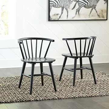 Show moreIntroducing the Signature Design by Ashley Otaska Modern Farmhouse Spindle Dining Chair set, where elegant design meets robust durability. Crafted from solid wood, these chairs are built to withstand the test of time while adding a chic touch to your home. Each chair in this stylish duo features a sleek black finish, offering a neutral appeal that seamlessly integrates with various decor styles. The graceful low spindle back and gracefully turned legs embody the essence of urban casual aesthetics, making them the ideal choice for any modern dining space.