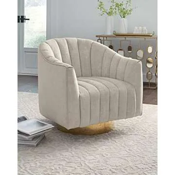 Show moreThe Signature Design by Ashley Penzlin Swivel Accent Chair is a stunning embodiment of modern elegance and functionality. Drenched in plush, polyester velvet upholstery, this accent chair exudes a sophisticated charm that seamlessly integrates into any living space. Its distinctive barrel back and attached seat cushion are designed for ultimate comfort, striking a perfect balance between aesthetic appeal and practicality. Supported by a chic brass-tone metal swivel base, this chair not only enhances your decor but also facilitates easy movement, making it ideal for both relaxing and engaging conversations. Measuring 29.5" W x 29.5" D x 30.7" H, it is perfectly sized for small areas, providing just the right touch to liven up your home without overwhelming the space.