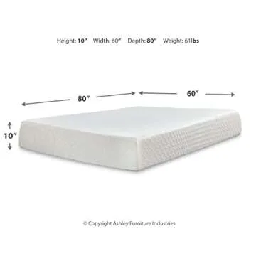 Show more Experience the ultimate sleeping comfort with the Signature Design by Ashley Queen Size Chime 10 Inch Medium Firm Memory Foam Mattress. This luxurious mattress features advanced memory foam technology infused with Green Tea and Charcoal Gel, ensuring a refreshing sleep experience while effectively combating odors. With a medium-firm feel, this mattress strikes the perfect balance between support and comfort, promoting healthy spinal alignment and pressure relief for a more restful night of sleep.