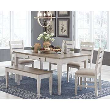 Show more Transform your dining area with the **Signature Design by Ashley Skempton Farmhouse Rectangular Dining Room Table with Storage**. This exquisite piece combines functionality and elegance with its rich brown top featuring a charming plank effect and a chic grayish-white base. Made of quality wood, acacia veneer, and engineered wood, this table isn't just a feast for the eyes but is also built to last. Its multi-functional design adapts beautifully, acting as a dinner table, workspace, or perfect spot for game nights. Exceptional craftsmanship and attention to detail make this table a centerpiece that will enhance any dining experience and elevate your home decor.