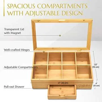 Show more Introducing the beautifully crafted bamboo tea organizer box, a perfect blend of functionality and aesthetics! This elegantly designed tea caddy measures 12"x 7.5"x 4" and features 8 adjustable compartments that provide ample storage space for all your favorite tea bags. With this organizer, you'll never have to rummage through clutter again; keep everything neatly arranged while adding a touch of charm to your kitchen or tea corner.