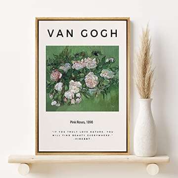 SIGNLEADER Framed Canvas Print Wall Art Van Gogh Pink Roses 1890 Decorative Brushstroke Illustrations Fine Art Colorful Multicolor Warm for Living Room, Bedroom, Office - 16"x24" Natural