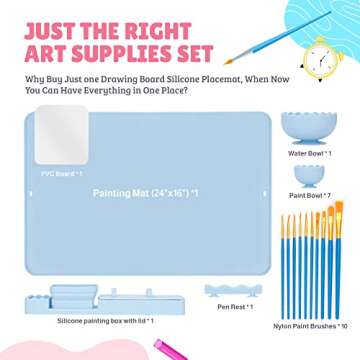 Show more Unleash your inner artist with this premium silicone painting mat set, designed for creative minds of all ages. This comprehensive package includes everything you need to dive into your artistic projects, from painting to DIY crafts. The set features a spacious 24x16 inch non-slip silicone mat, making it the perfect canvas for any endeavor.