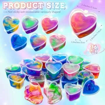 Show more Introducing the Silipull 36 Pcs Valentine's Day Galaxy Stress Relief Fidget Toy! This delightful pack of 36 vibrant, heart-shaped stress relief putties brings a playful touch to stress management. Perfect for both kids and adults, these non-sticky putties come in an eye-catching assortment of colors – gold, silver, blue, green, pink, and purple – measuring approximately 2.3 x 2.2 x 1.2 inches each. Whether you're at home, school, or a party, unleash your creativity and experience sensory joy with these glittery, heart-shaped treasures that are sure to grab attention and inspire imaginative play!