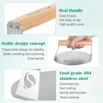 Show more Introducing the SILUB Smash Burger Press, the ultimate culinary companion for all burger enthusiasts! This 304 stainless steel marvel is engineered for durability and performance, allowing you to create perfectly shaped burger patties every time. Measuring 6.0 inches in diameter with a robust 2mm thickness, and weighing nearly 1 pound, this press delivers optimal pressure that guarantees juicy, flavorful burgers whether you're grilling, frying, or cooking on a flat top griddle. Say goodbye to uneven patties and hello to a new standard in homemade burgers!