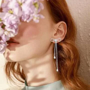 Silver Bow Earrings for Women Sparkle Earrings Long Silver Earrings Dangle Rhinestone Drop Earrings Bling Gold Bowknot Earrings Gold Dangle Earrings