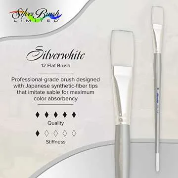 Show more Introducing the **Silver Brush Limited 1501-12 Silverwhite Flat Paintbrush**, an exceptional tool meticulously handcrafted by expert artisans. Designed for artists who blend a variety of media—from vibrant watercolors to rich gouaches—this size 12 flat brush seamlessly combines performance and quality. It features premium Japanese synthetic fibers, emulating the luxurious feel of red sable, allowing artists to experience superior paint application with each stroke. The small ridges on the brush tips are cleverly designed to absorb and hold maximum color, enhancing your creative workflow with every brushstroke.