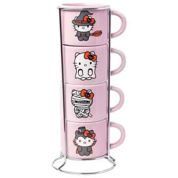 Silver Buffalo Sanrio Hello Kitty Halloween 4 Pack Stackable Ceramic Mug Set With Storage Rack, 3 Ounces