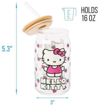 Silver Buffalo Sanrio Hello Kitty Strawberry Glass Jar Tumbler with Bamboo Lid and Glass Straw, 16 Ounces