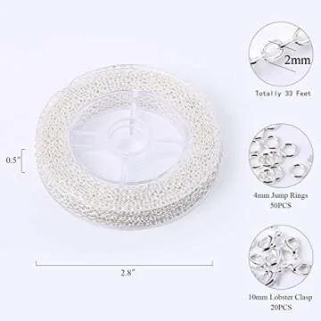 Unleash your creativity with our Silver Chain for Jewelry Making, a stunningly versatile solution for all your DIY jewelry projects. This 33-feet long spool of delicate 2mm thin chain is perfect for crafting unique necklaces, bracelets, and more, allowing you to add your personal touch to every piece. Made from solid brass and silver plated for a lasting finish, this chain is designed to maintain its shine and beauty over time, making it a reliable choice for both beginner...