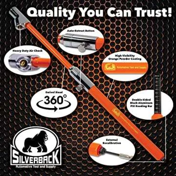 Unlike standard tire gauges that may falter in accuracy or durability, the Silverback model features superior materials and craftsmanship. Competitors often lack the auto-retract functionality, making the Silverback gauge easier to use and more reliable. Other gauges may not provide the same high visibility or clear reading capabilities, especially under various light conditions, setting the Silverback gauge apart in the automotive tool market.