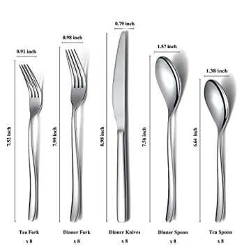 Show moreElevate Your Dining Experience with our elegant 40 Piece Silverware Set. This exquisite flatware collection includes everything you need to serve your family and guests with style: 8 dinner knives, 8 dinner forks, 8 dinner spoons, 8 teaspoons, and 8 salad forks. Crafted from high-quality stainless steel, this set shines with a stunning mirror polish that instantly adds sophistication to your table setting. Whether it's a casual family meal or an upscale dinner party, you'll receive numerous compliments from your guests, making it a delightful addition to your dining essentials.
