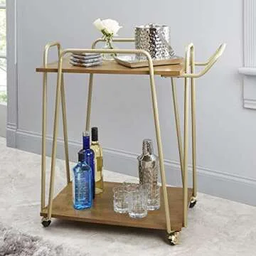 The Silverwood Emory 2-Tier Hairpin Bar Cart combines style and functionality, making it the perfect addition to your home. This modern bar cart boasts two elegant rectangular wooden tiers, beautifully contrasted by a hairpin-style frame in a radiant gold finish. Its airy design not only enhances your decor but also provides ample open storage space, enabling you to showcase your favorite beverage collections, glassware, and decorative items. The cart's dimensions of 30.37 inches...